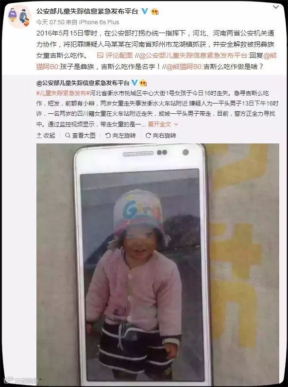 该账号共发布11条微博,其中涉及五起儿童失踪案,其中5月13号发布了一条彝族女孩被拐信息。在公安部刑侦局打拐办的统一指挥下,河北、河南两省公安机关的通力协作下,已于今天凌晨被安全解救。