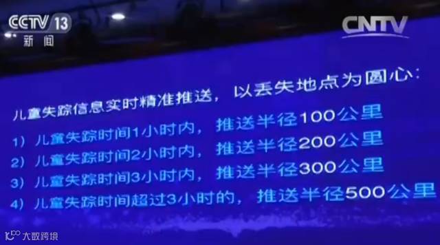 与此同时,相关信息会按照规则推送到比如“团圆”等相关的社交网络。以儿童丢失地点为圆心,儿童失踪1小时以内,相关信息将被推送给半径100公里地域的人群;失踪2小时以内,推送半径200公里;失踪3小时以内,推送半径300公里;超过3小时的,推送半径达500公里。
