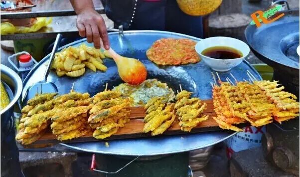 3.洋人街上的烤饵块,味道很赞!饵块其实就是我们的年糕,里面会裹入各种调料,什么芝麻酱啊,辣椒酱啊,花生酱啊,肉酱啊之类的,还可以加一根烤香肠。在烤架上把圆饼饵块烤得软软的,涂上那些酱料,卷起来,一份新鲜诱人的烤饵块就出炉了。