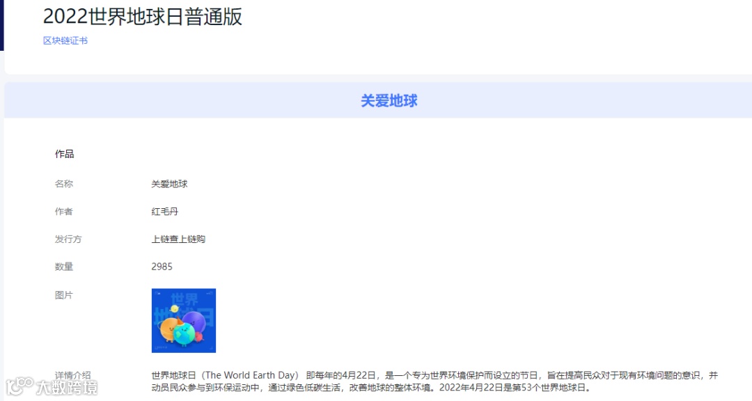 此款藏品为世界地球日系列普通款藏品,发行数量2985份,初始定价9.9元。存证信息: