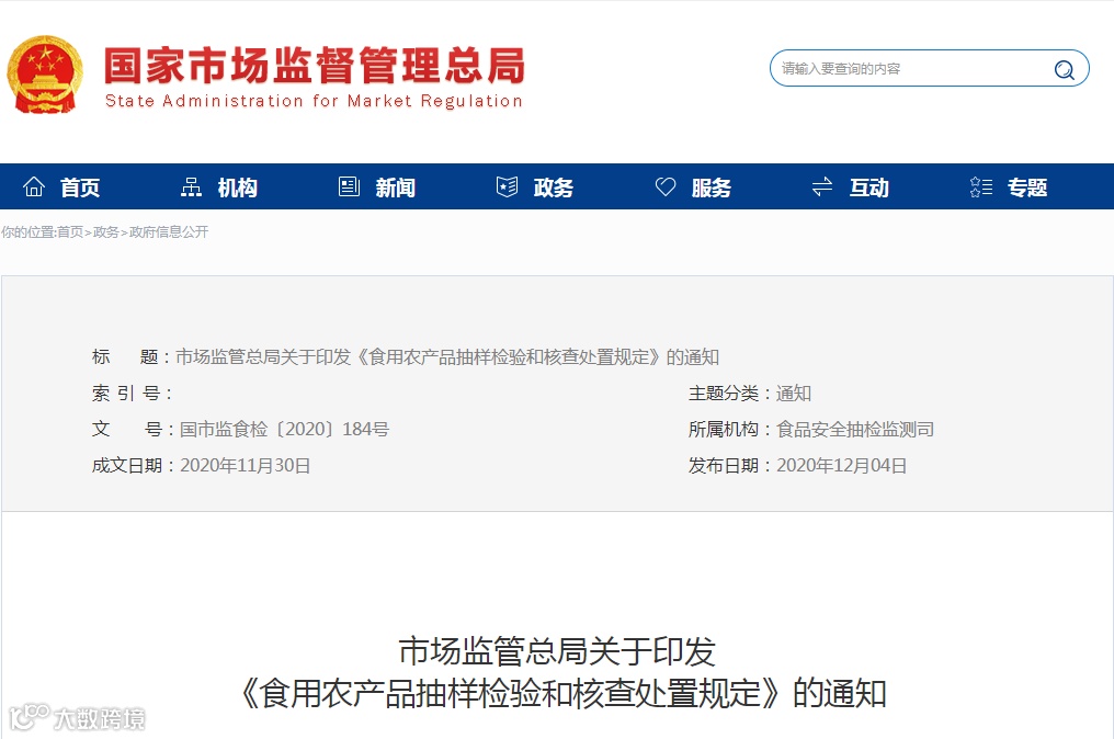 12月4日,国家市场监管总局网站消息,为进一步规范食用农产品抽样检验和核查处置工作,依据《中华人民共和国食品安全法》等法律、法规和规章,制定行政规范性文件《食用农产品抽样检验和核查处置规定》。《规定》明确, 食用农产品销售者收到不合格检验结论后,应当立即对不合格食用农产品依法采取停止销售、召回等措施,并及时通知相关生产经营者和消费者;对停止销售、召回的不合格食用农产品应依照有关法律规定要求采取处置措施,并及时向市场监管部门报告。