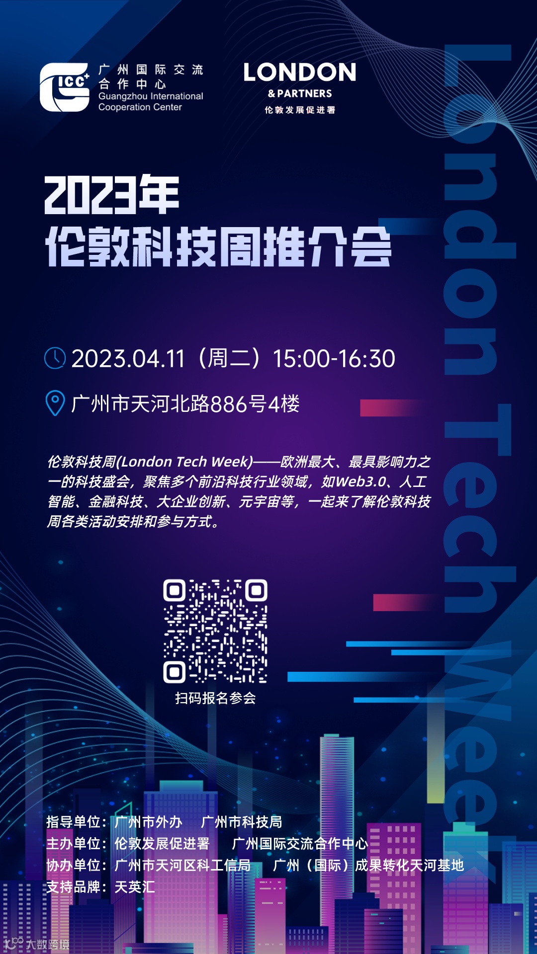 第十届伦敦科技周将于2023年6月12日至16日在伦敦盛大开启,本届活动围绕“塑造未来:集结全球科技力量,推动可持续创新”的主题。为了帮助对科技创新感兴趣的广州企业家、投资人、科技从业者、学者或是政策制定者深入了解2023年伦敦科技周的活动详情和参与方式,推动广州科技企业在国际科技舞台上积极发声,促进广州与境外前沿科技领域的深入交流、推进合作,广州国际交流合作中心联合伦敦科技周主办方之一伦敦发展促进署,连线伦敦、以线上线下交流方式共同举办本场“2023年伦敦科技周主题推介会”。