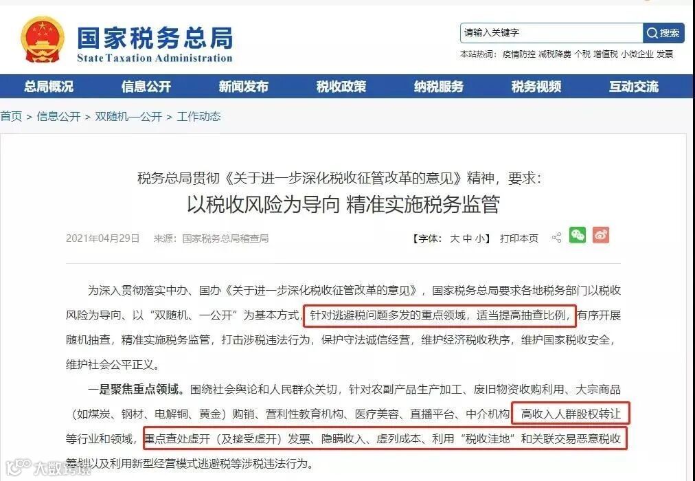 2021年4月29日,为深入贯彻落实《关于进一步深化税收征管改革的意见》精神,国家税务总局提出“以税收风险为导向 精准实施税务监管”的总体要求,要求各地税务局以税收风险为导向,针对逃避税问题多发的重点领域适当提高抽查比例,提出精准实施税务监管,打击涉税违法行为,明确将高收入人群股权转让纳入本次行动的八大聚焦重点领域之一。