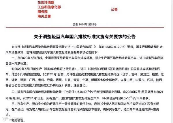 近日,生态环境部等四部门发布《关于调整轻型汽车国六排放标准实施有关要求的公告》。公告中显示,自2020年7月1日起,全国范围实施轻型汽车国六排放标准,禁止生产国五排放标准轻型汽车,进口轻型汽车应符合国六排放标准。