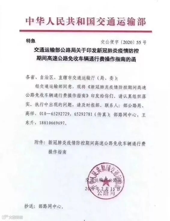 2月15日,交通运输部正式发布《关于新冠肺炎疫情防控期间免收收费公路车辆通行费的通知》:2月17日零时起至疫情防控工作结束,全国收费公路免收车辆通行费。