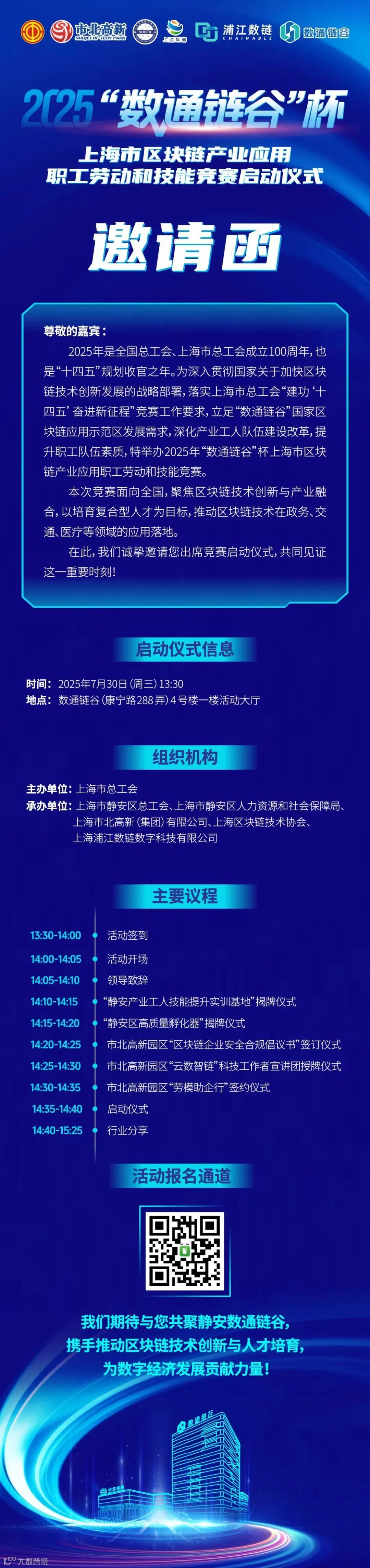 为进一步推动区块链技术创新与产业融合,构建技术、产业、人才协同发展生态,2025“数通链谷”杯上海市区块链产业应用职工和技能竞赛启动仪式将于7月30日举行。