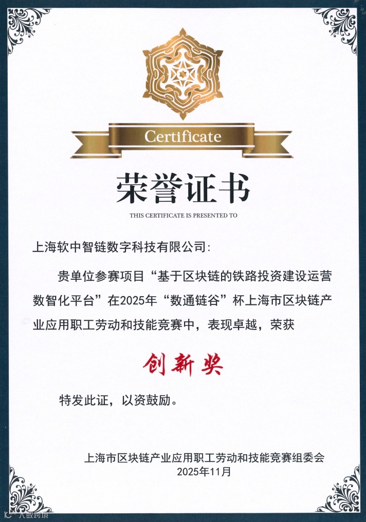 18日,软中智链参赛项目“基于区块链的铁路投资建设运营数智化平台”在2025年“数通链谷”杯上海市区块链产业应用职工劳动和技能竞赛中,表现卓越,荣获创新奖。