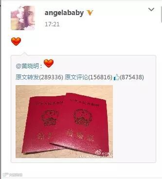 这回是真心有图有真相了。黄晓明在微博上放出了秀恩爱终极大绝招——结婚证!那一瞬间闪瞎了所有单身狗的狗眼。紧接着Angelababy就转发并置顶,告诉大家一个悲伤的事实:“姐彻底名花有主啦!”