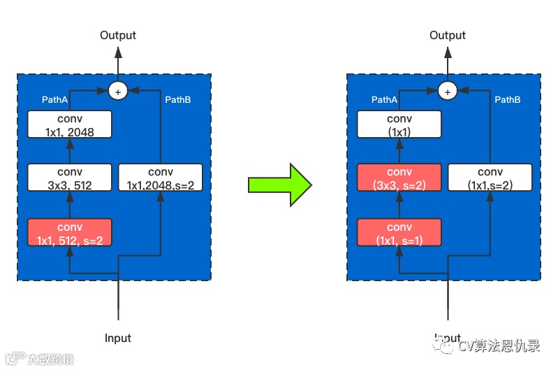 如下图所示,我们将 PathA 中大小为 1x1,步长为 2 的卷积层替换为大小为 1x1,步长为 1 的卷积层,为了保持下采样层输出特征图的大小不变,我们将原本卷积核大小为 3x3,步长为 1 的下一个卷积层改成卷积核大小为 3x3,步长为 2 的卷积层。