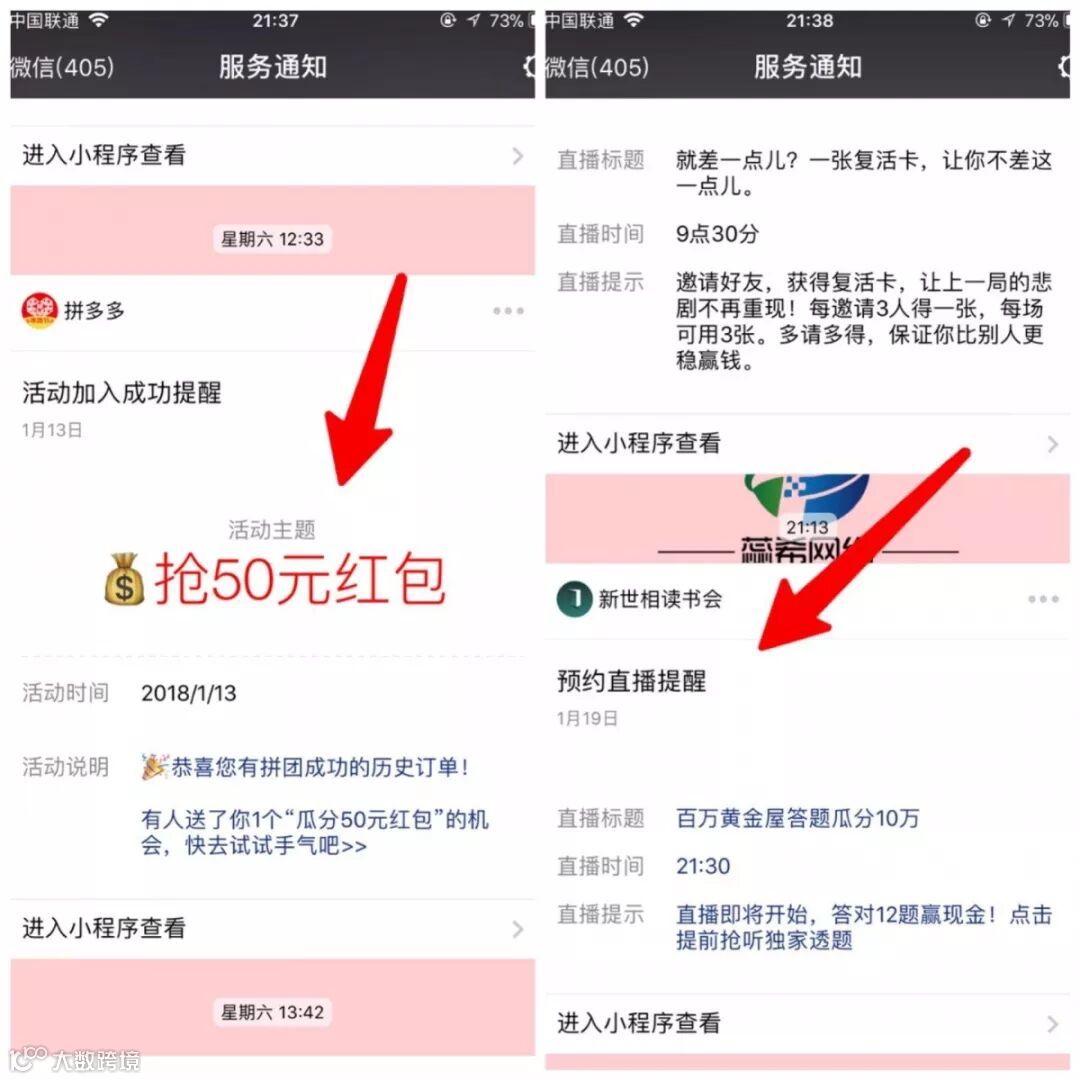 不知道大家有没有注意到,自己微信消息列表栏里的“服务通知”功能,时不时会跳出一个提醒,点击进入后如下图所示:没有在拼多多购物,也没有预约收看直播,有时候就是会莫名收到一个消息提醒,这个时候又不得不好奇的点击进入查看。