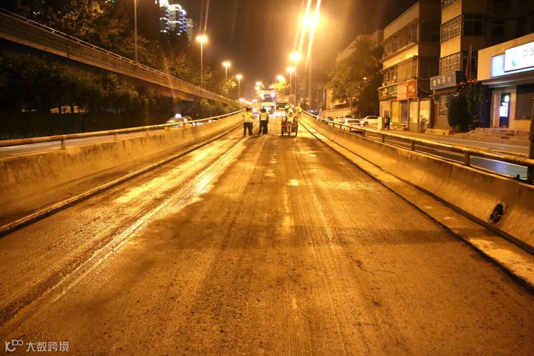 2018年9月21日陕西省西安市开远门桥改性沥青路段夜间铺设现场: