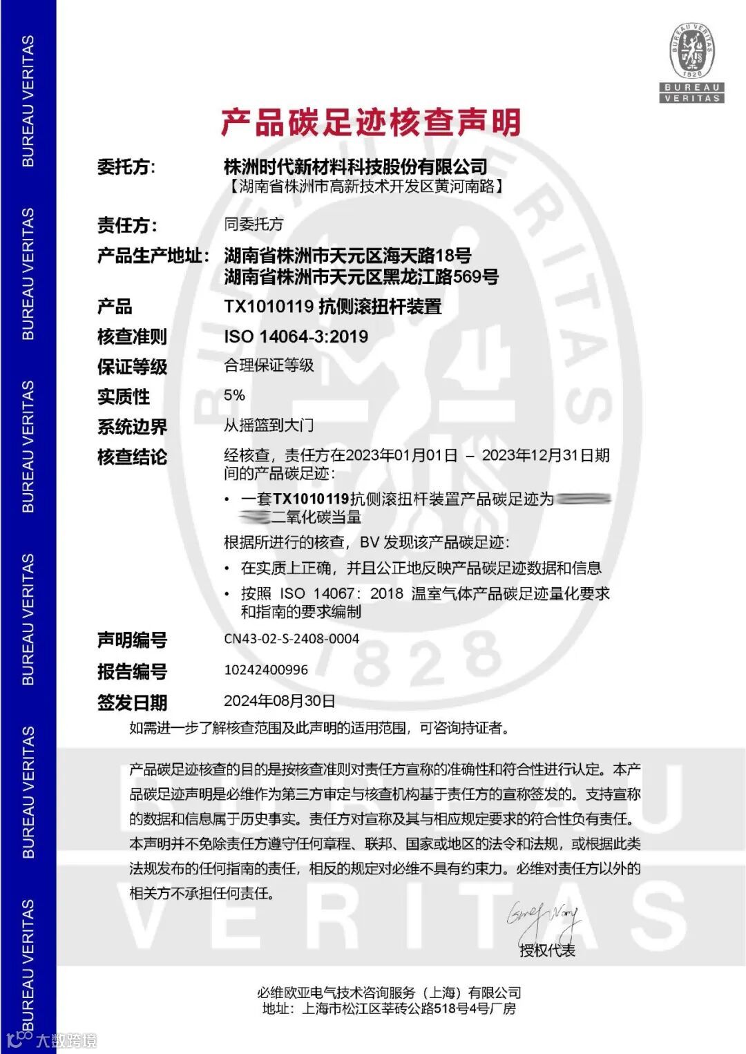 为应对全球气候变化,实现可持续发展目标,多年来,时代新材将绿色低碳作为重要发展战略,全面系统推进双碳工作走深走实。经过一年的盘查与核查,在重庆大学团队的指导下,时代新材完成了全范围全级次组织碳排放核查,以及三款典型产品(空气弹簧、橡胶金属件、扭杆)的碳核查工作,并顺利获得必维集团颁发的碳排放核查证书。