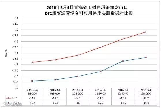 (图为2016年3月5日,青海省交通科学研究院与北京秦天科技集团有限公司,共同对青海省玉树曲麻莱加龙山口DTC自调温相变材料应用路段进行检测。数据表明,添加DTC道路比未添加DTC道路的平均温度高2-3度。)