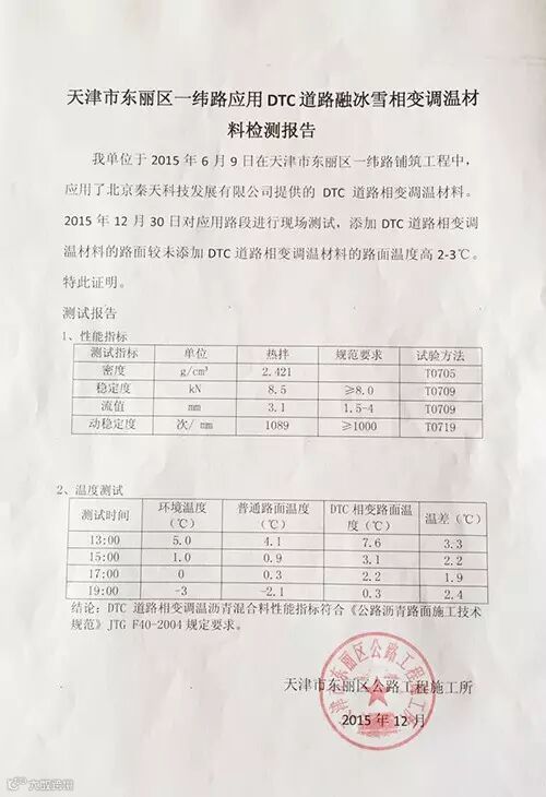 为此,天津东丽工程施工所,出具《DTC道路融冰雪相变调温材料检测报告》,DTC道路相变调温沥青混合料性能指标符合《公路沥青路面施工技术规范》,该相变调温材料在不改变沥青混合料配比前提下,拌合过程中投放方法简便,且混合料均匀性良好,满足路用性能规范技术要求。减缓了路面冰冻带来的安全隐患,给市民出行带来安全与便利,确保城市交通畅通。