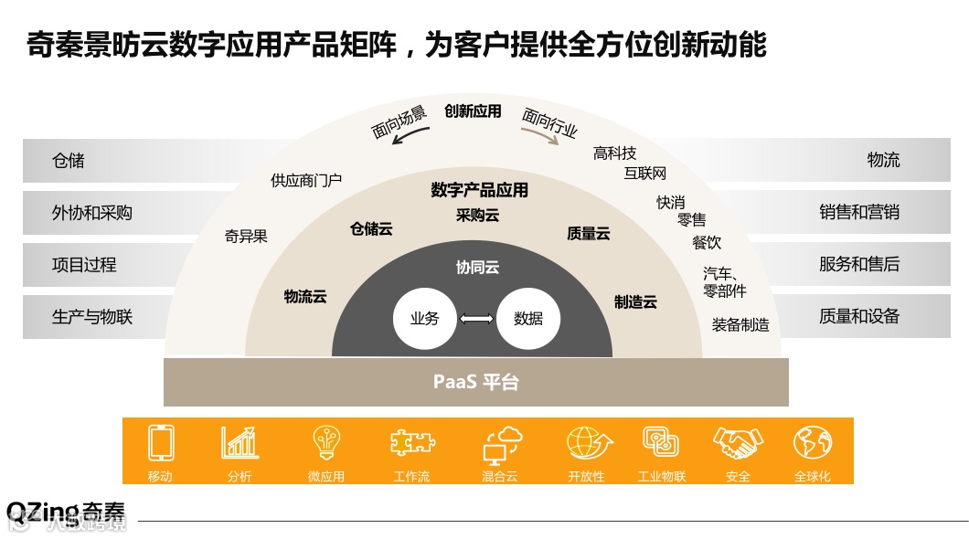 奇秦通过多年助力企业信息化转型经验,形成了新一代数字供应链平台--景昉云平台,根据企业所涵盖的业务领域,把数字应用融合成六朵云:采购云、仓储云、制造云、物流云、质量云、协同云,以这六朵云作为触点撬动企业整个业务线,贯穿产业上下游的有序数据链条,打通产业互联,助力智能制造数字提升。