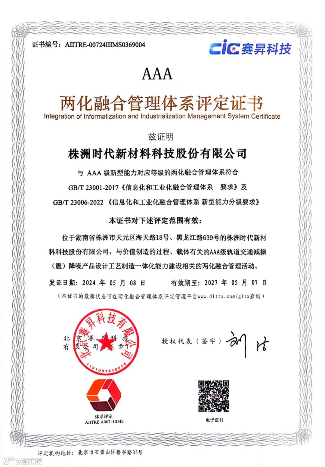 2017年,时代新材首次完成两化融合体系认证,并于2022年、2023年先后通过A级、AA级认证,本次成功通过轨道交通减振(震)降噪产品设计工艺制造一体化能力AAA级评定,工作成效不断攀高。