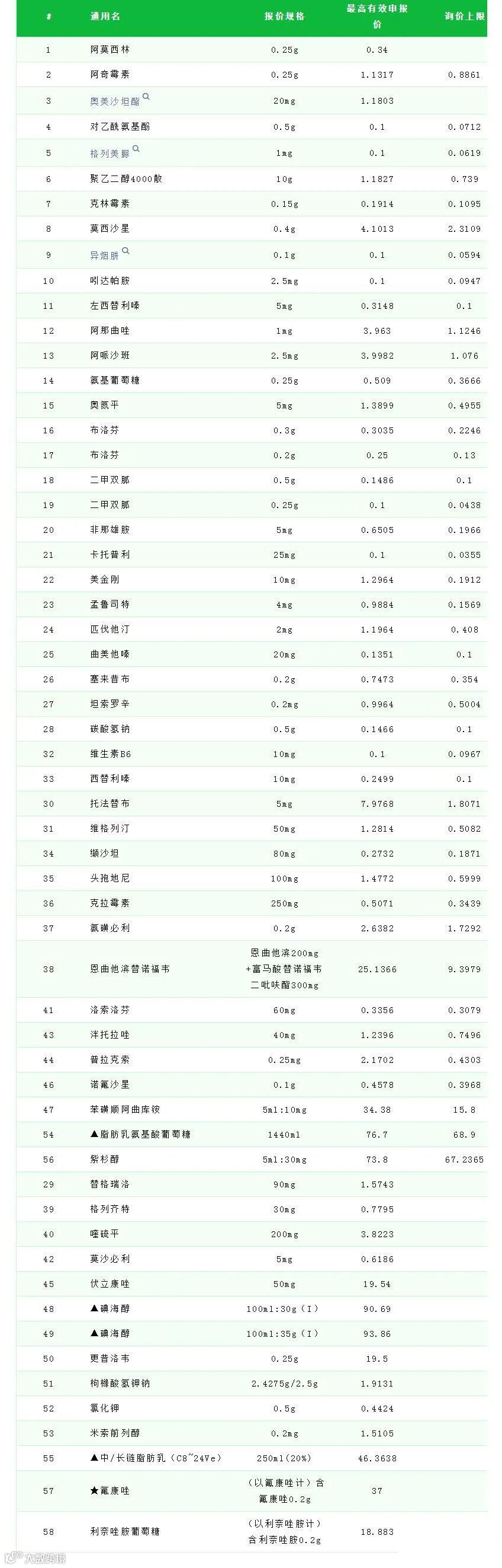 共有 58 个品种,简要列举具体如下(单位:元):