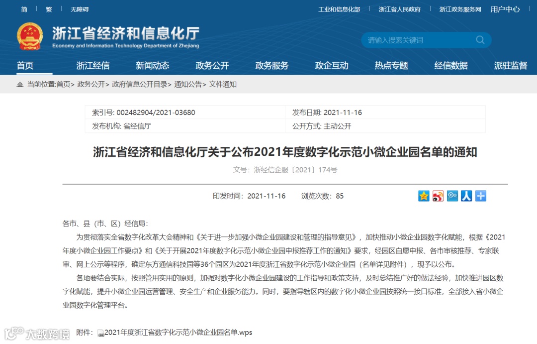 2021年11月16日,浙江省经济和信息化厅公布了《2021年度浙江省数字化示范小微企业园名单》,共计36个园区上榜省级示范,其中有22个园区由我司提供数字化平台建设。
