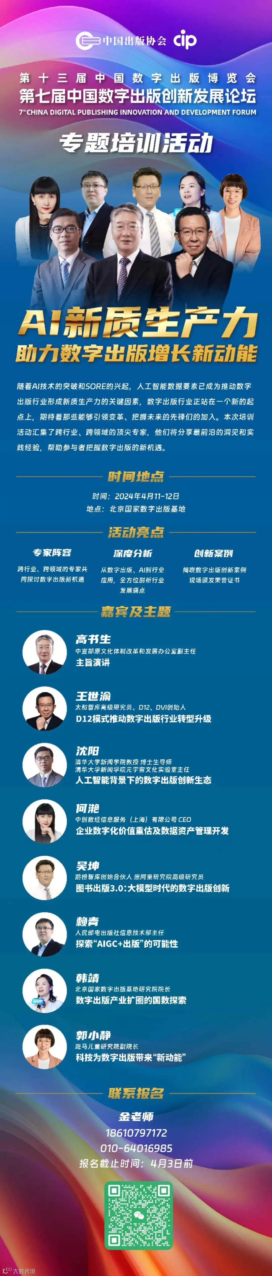 图书从1.0时代的纸质书,到2.0时代的电子书,正在迎来他的3.0时代,即大模型时代。读者需要更加丰富的知识服务体验,作者拥有了更加强大的图书创作工具,我们应该如何利用新的数字技术,重塑我们的知识服务,是摆在每一个出版人面前不容回避的问题。