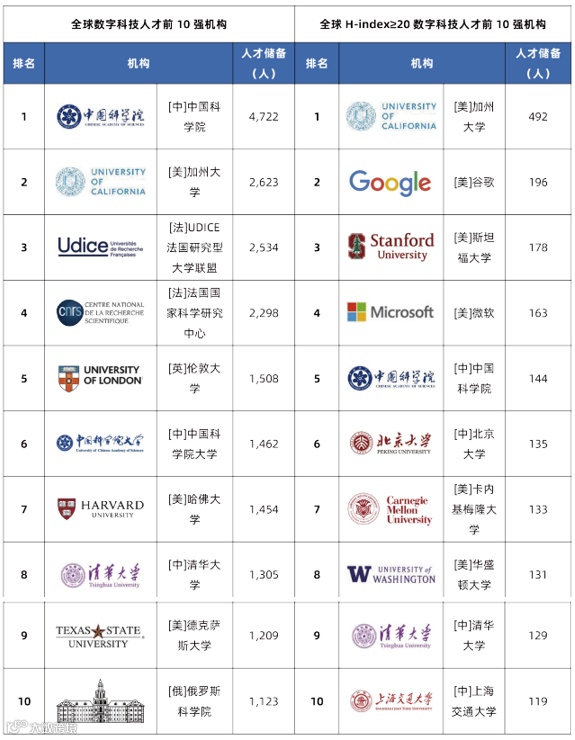 表3 全球数字科技人才数量前10强机构