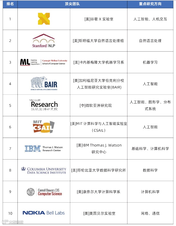 报告显示,全球数字科技顶尖科研团队基本被美国机构包揽。全球数字科技顶尖科研团队(Top10)基本来自美国顶尖高校(如斯坦福大学、卡内基梅隆大学、加利福尼亚大学、麻省理工学院、哥伦比亚大学、康奈尔大学等)、科技巨头(如谷歌、微软、IBM等)下设的科研机构(如下表所示)。