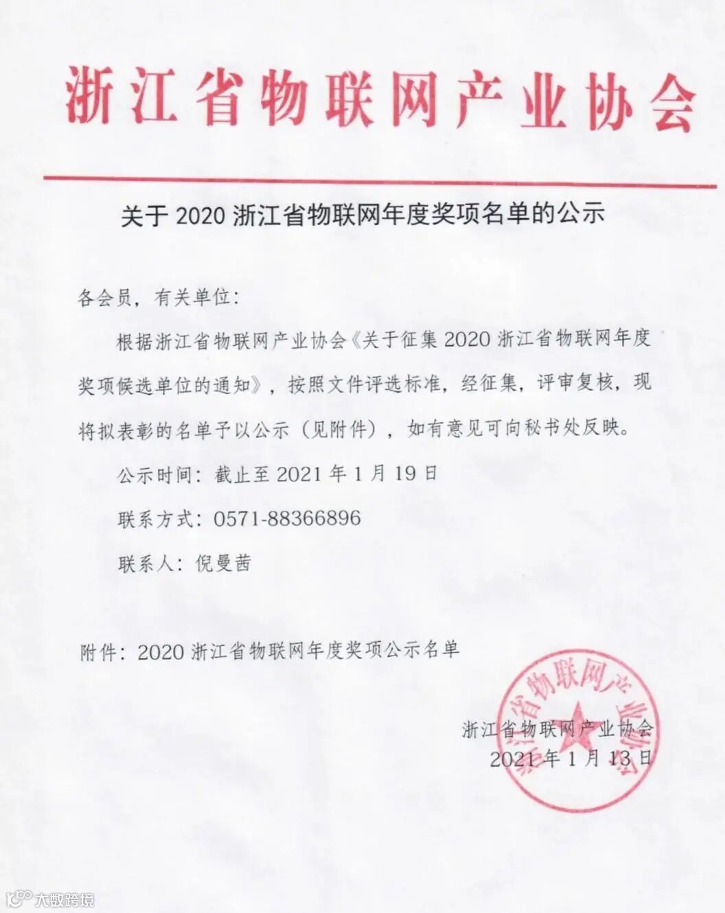 今天上午,浙江省物联网产业协会发布《关于2020浙江省物联网年度奖项名单的公示》,齐圣科技荣获2020浙江省数字化小微企业园建设特别贡献奖。