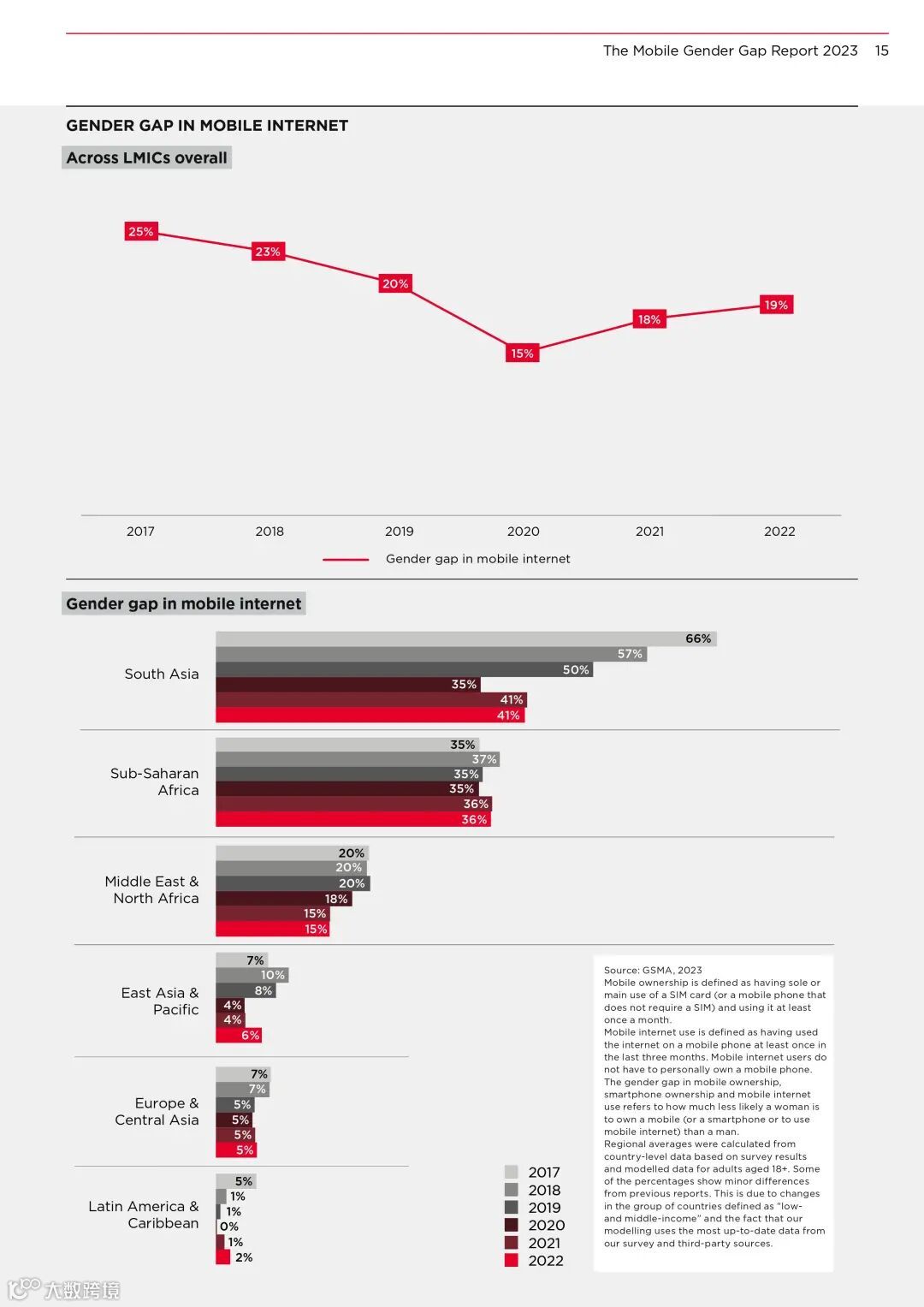 数据显示,中低收入国家的移动互联网使用性别差距已从2017年的25%降至2020年的最低水平15%,但在2022年再次上升至19%。在撒哈拉以南非洲,移动互联网使用性别差距从2017年的35%上升到2022年的36%;但在中东和北非 (MENA),这一比例已从2017年的20%下降到2022年的15%。