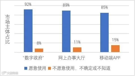 根据中山大学最新发布的24省中国“数字政府”建设调研报告,全国 “数字政府”需求侧建设已经进入大规模知晓阶段,正在进入大规模使用阶段。其中,92%的市场主体表示愿意使用“数字政府”。