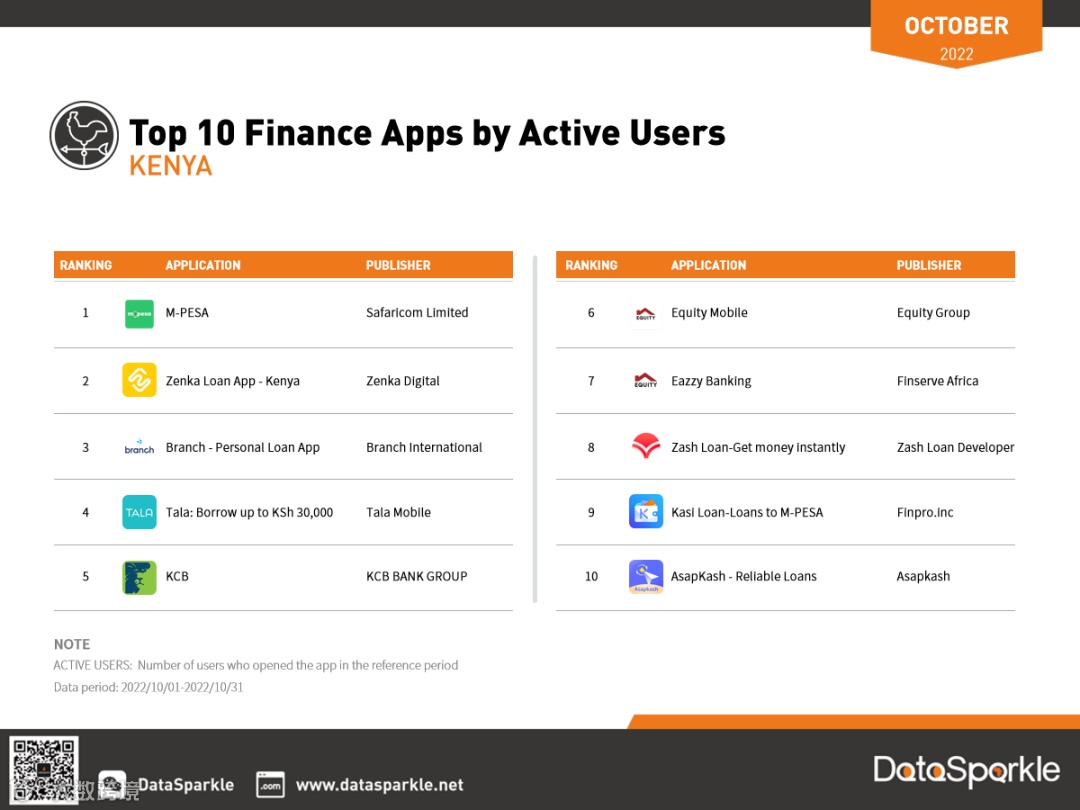 肯尼亚财务类应用用户使用排行TOP10,数据来源:DataSparkle