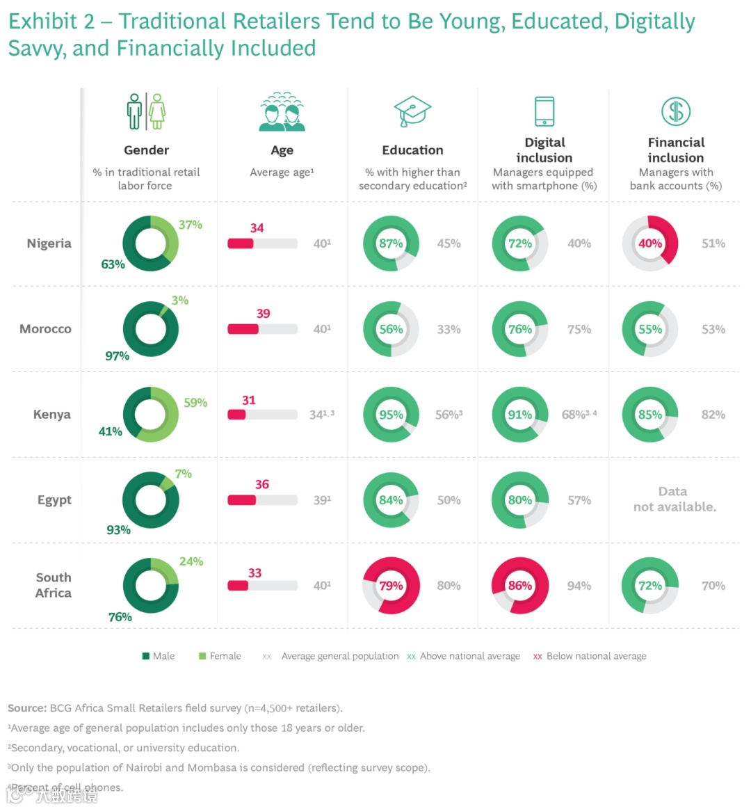 在非洲人口高度结构年轻化的大背景下,非洲传统零售商的经营者也普遍年轻且受过教育。报告数据显示,非洲传统零售商经营者平均年龄不超过 39 岁。在报告研究的国家中,超过 70% 的传统零售商经营者接受过高中、职业或大学教育。