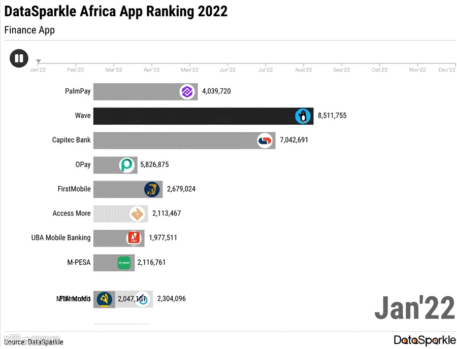 图:非洲移动应用财务品类活跃用户规模TOP10变化