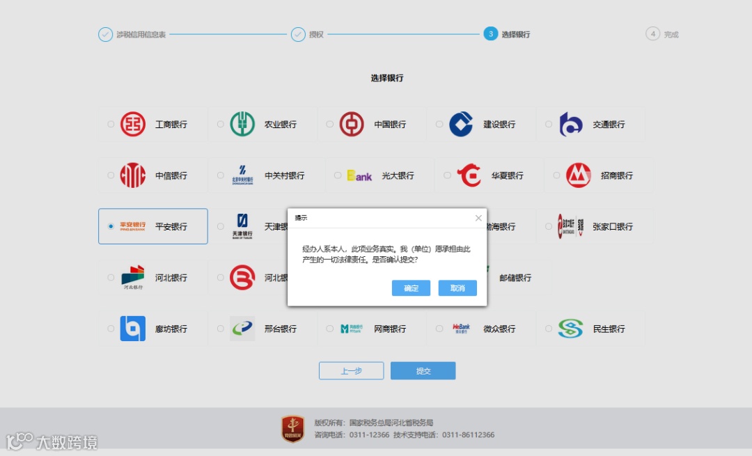 5、选择相对应授权的银行进行提交(确认是否企业经办人,业务是否真实再点击确定继续提交)。