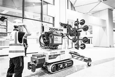 重庆东站施工现场,工作人员在操作幕墙安装机器人。受访单位供图