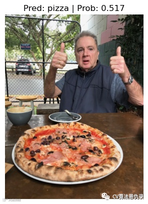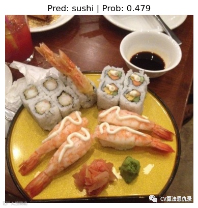 这次 efficientnet_b0 模型预测概率高于 TinyVGG() 的预测概率。