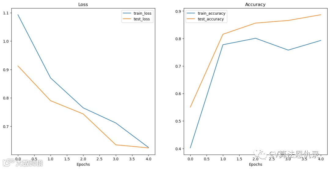 看起来两个数据集(训练和测试)的损失都朝着正确的方向发展。与精度值相同,呈上升趋势。这显示了迁移学习的力量。使用预训练模型通常可以在更短的时间内使用少量数据获得非常好的结果。