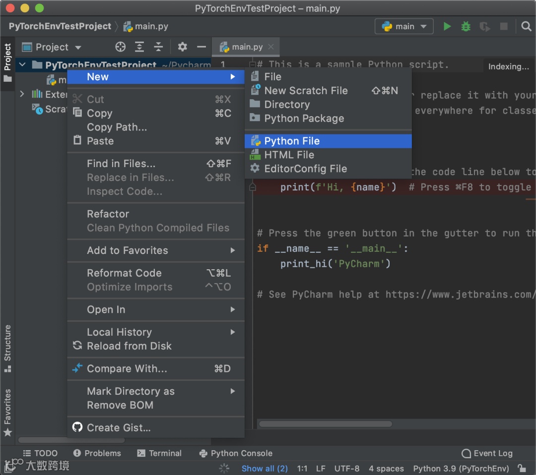 这样就成功配置了PyCharm的编译环境是刚刚创建的虚拟环境,接下来可以写个测试程序,验证是否成功。新建一个Python文件: