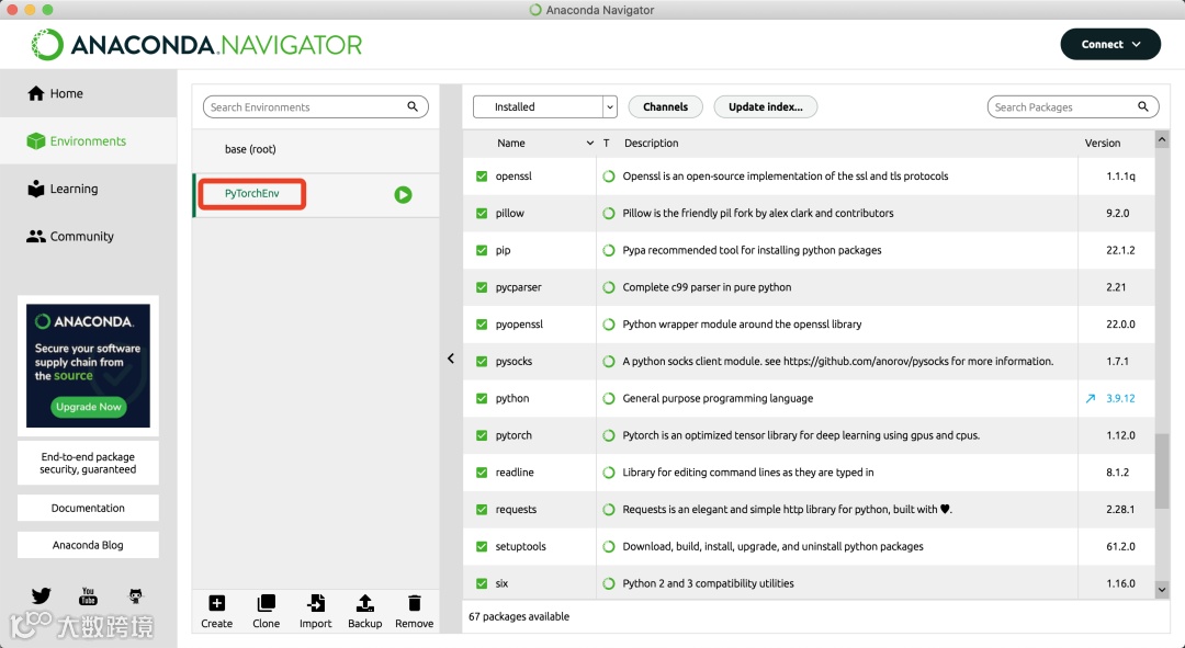 此时在Anaconda的Navigator里已经可以看到新创建的虚拟环境PyTorchEnv了。