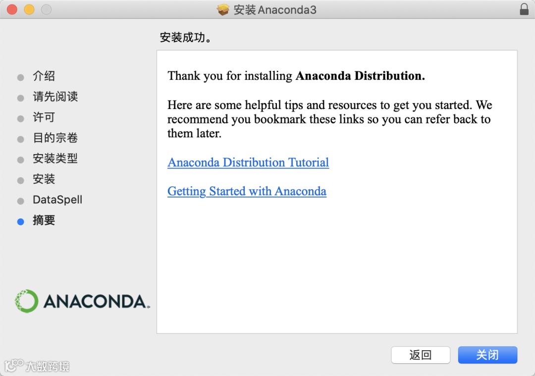 (4)点击关闭就完成了Anaconda的安装,此时 Python 和 Jupyter Notebook 也就同步安装完成了。