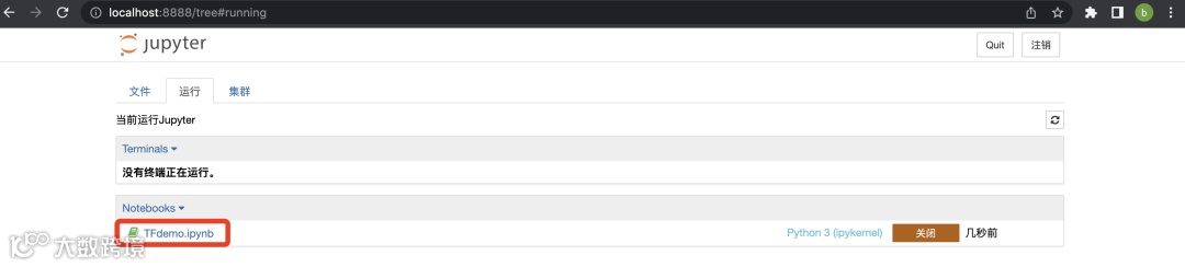 (3)修改文件名并保存文档后,再回到主界面,可以看到在文件标签页里面多了一个TFdemo.ipynb文件;在运行标签页多了一个运行中的文档。