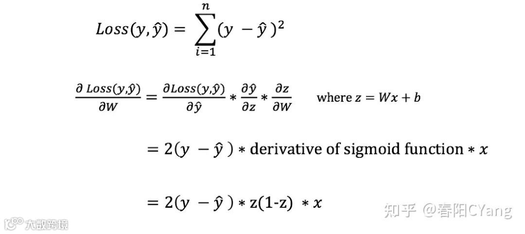 然而,我们不能直接计算损失函数对权重和偏差的导数,因为损失函数的方程并不包含权重和偏差。因此,我们需要链式法则(Chian Rule)来帮助我们计算它。