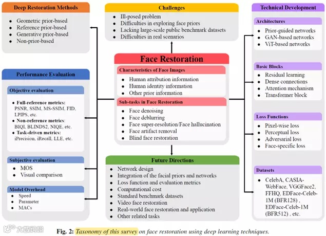 这个部分全面地回顾了基于深度学习的人脸复原方法的技术发展过程,主要从以下几个方面进行总结和分析:网络模型的基本架构、使用的基本模块、模型使用的损失函数和人脸相关的基准数据集。