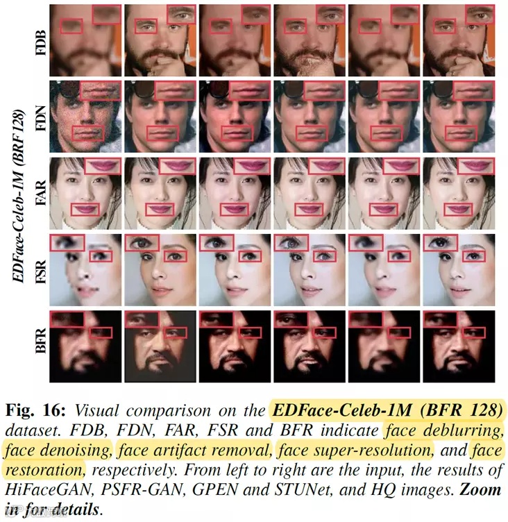 4. 人脸去伪影任务(Face Artifact Removal, FAR):去除人脸图像压缩过程中出现的伪影,恢复出高质量的人脸;
