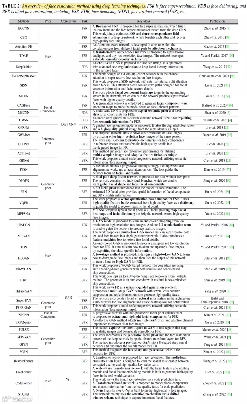 下图全面地总结了近年来基于深度学习的人脸复原方法的特点。