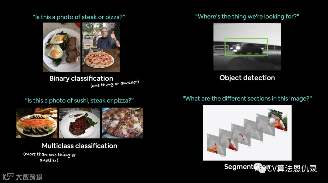 计算机视觉是教计算机看东西。例如,它可能建立一个模型来判断照片是猫还是狗(二元分类);或是判断照片是猫、狗还是鸡(多类分类);识别汽车出现在视频帧中的位置(对象检测);找出图像中不同对象的分离位置(全景分割)。