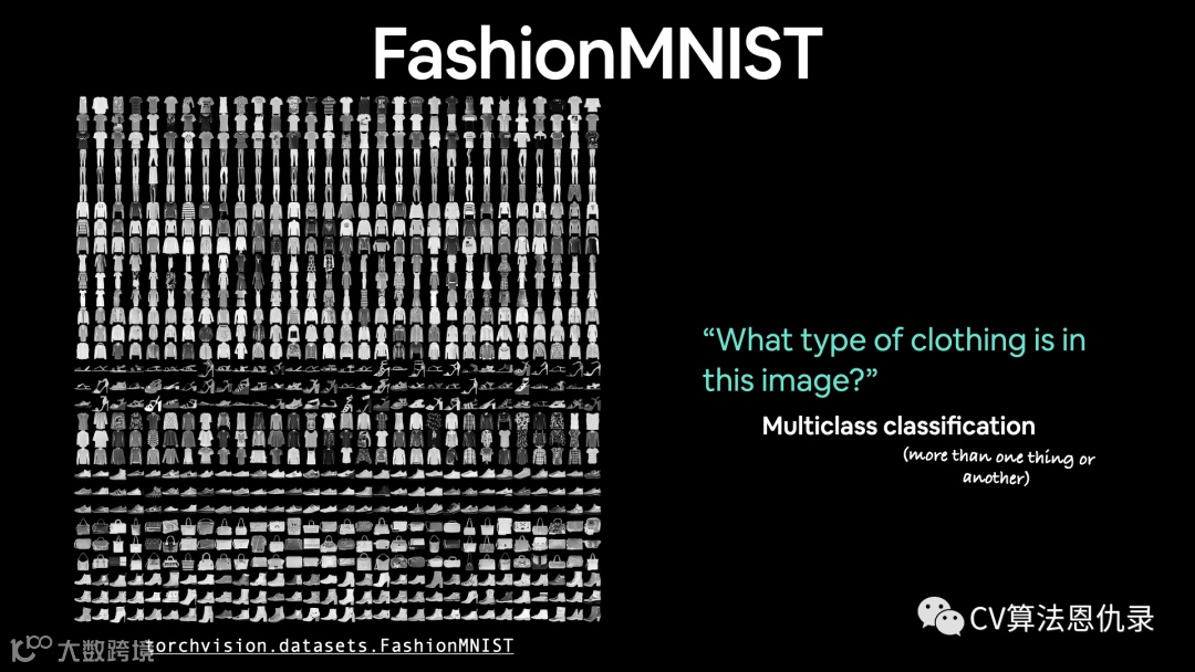 torchvision.datasets 含许多示例数据集,读者可以使用它们来练习编写计算机视觉代码。FashionMNIST 有 10 个不同的图像类别(不同类型的服装),是一个多类别分类问题。