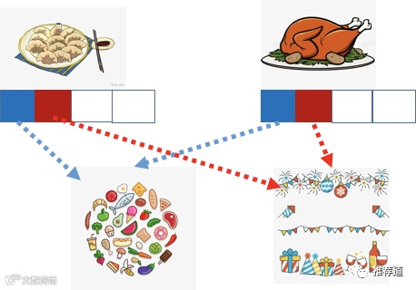 但是,如果我们根据业务知识,将概念拆解,如上图所示。两个特征向量的第一位表示“是否是食物”,从这个角度来看,饺子、火鸡非常相似;两个特征的第二位是“是否和节日相关”,从这个角度来看,饺子、火鸡也非常相似。