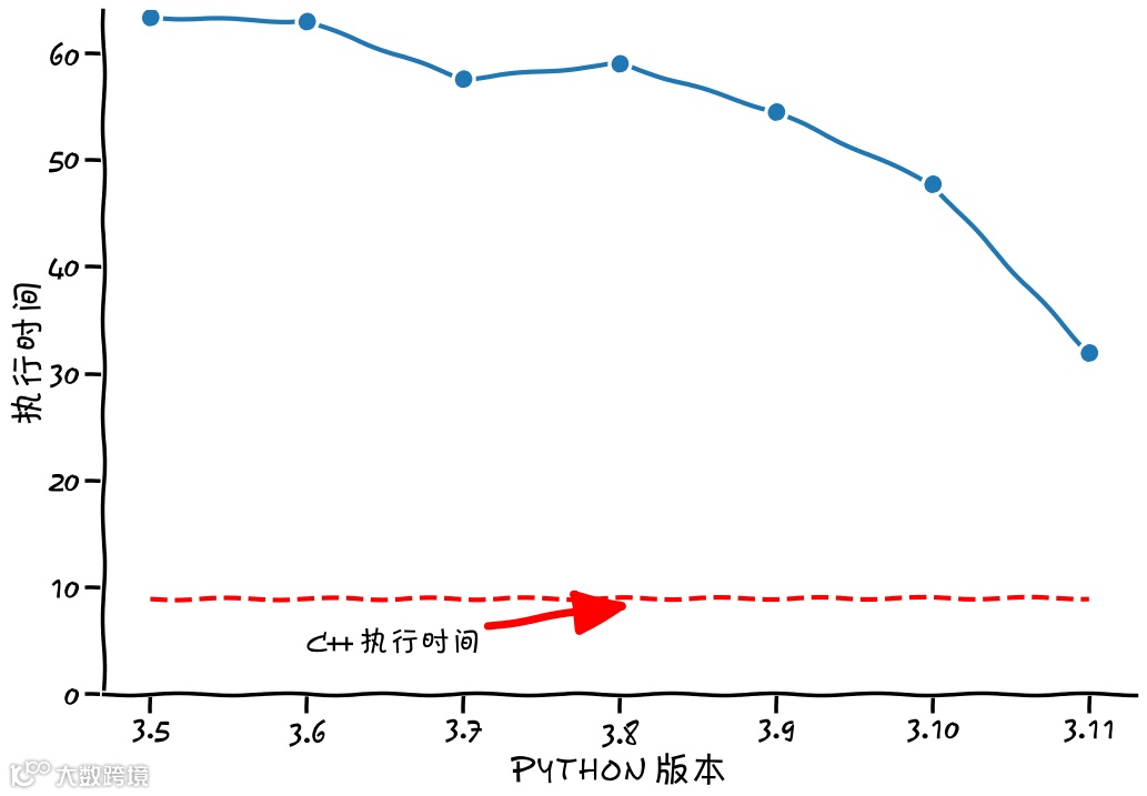 虽然这些 Python3.5 到 Python3.11 的基准测试是有效的,但这种推断当然只是一个玩笑。XKCD 风格的画图也是另一种提醒;-)