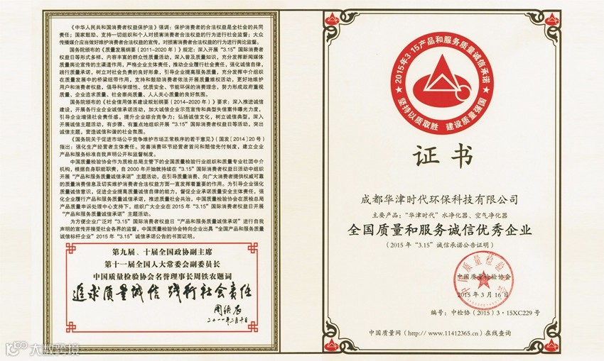 好消息,好消息!热烈祝贺成都华津时代环保科技有限公司被中国质量检验协会授予“全国质量和服务诚信优秀企业”!