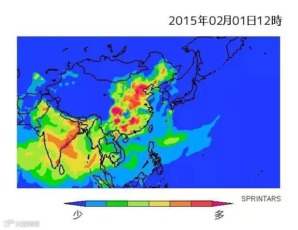 2015年1月31日,血块连成片后逐渐淡化,覆盖面增加的同时浓度在降低。途中橙色区域的读者到时候应该还是可以仰头看到“蓝天白云”的。