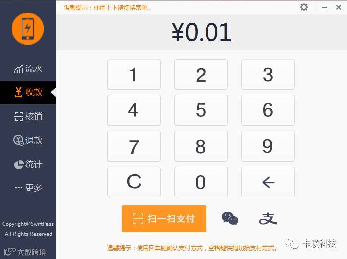 卡联科技主扫交易是指商户通过扫码抢或者手机摄像头扫描客户付款二维码进行支付,主扫交易具有反应快,小额免密,客户操作简单的特点。商户仅需购买红外线扫码抢或者手机摄像头扫码即可完成操作。